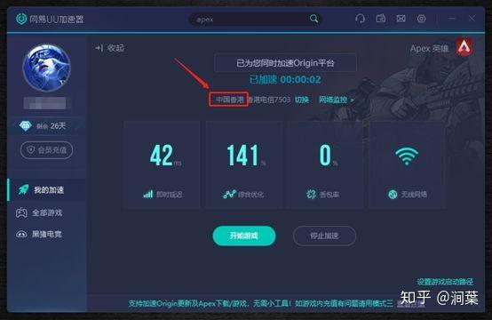 然后需要用到加速器,在这里以网易UU加速器为例(不是恰饭ebet真人官网app ,网易打钱!!!)是因为网易UU的加速效果可以达到后面Origin平台游戏下载时网络速度的峰值。打开网易UU加速器后找到APEX英雄这款游戏,选择中国香港区服进行加速。