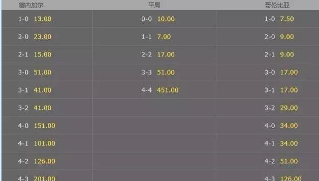 其中,足彩中“买正确比分”就比较像以上提到的情况,都是以小概率的小额赌注搏“大奖”!相对复杂一点的是,越可能出现的比分,赔率就越小,越是“荒唐”的比分赔率越高: