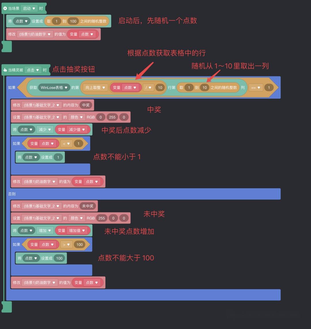 最后,看一下抽奖按钮上的积木逻辑。