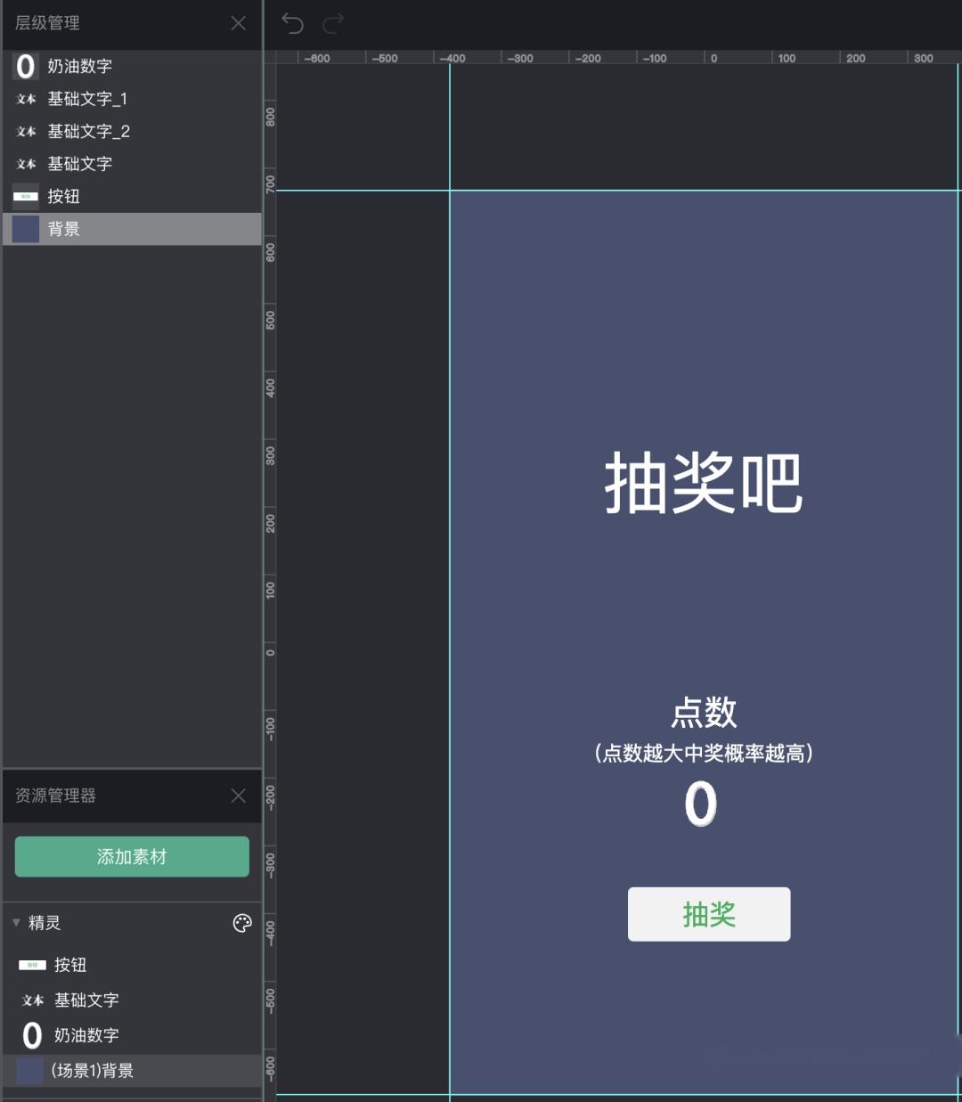 接着,我们布置一个简单的场景。一个抽奖按钮,一个当前的点数,一个是否中奖的提示。