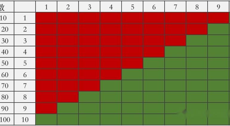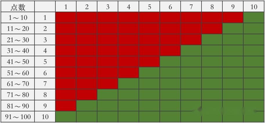 如图,就是一个 WIN-LOSS 表格,书中使用的是 16 进制,为了方便理解,我对其进行了修改和简化,改成了 10 进制,不过原理都是一样的。第一列表示的是点数,每个点数区间包含 10 个数字,右侧红色的格子表示不中奖,绿色的格子表示中奖。点数在 91 ~100 的时候,必定会中奖,点数在 1~10 的时候,基本上不会中奖,也就是说点数越大,中奖的概率就会越高。